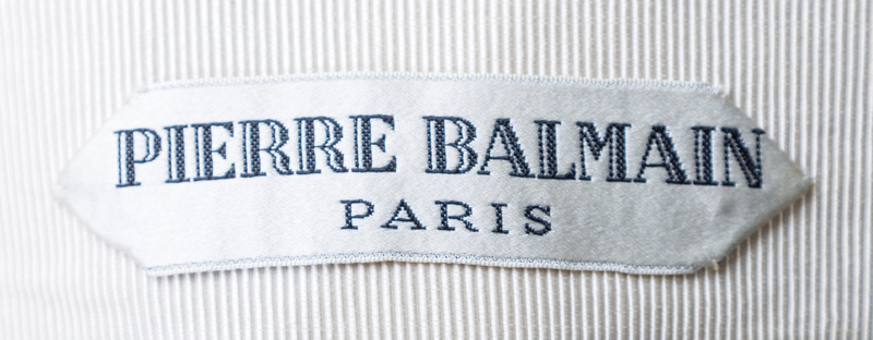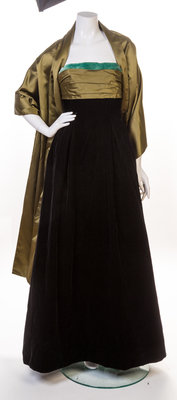 with a velvet skirt, a green satin ruched bust detail, green velvet trim and back bow detail, an interior corset and a back zip closure; together with a matching green satin shawl.Dress labeled: Pierre Balmain.