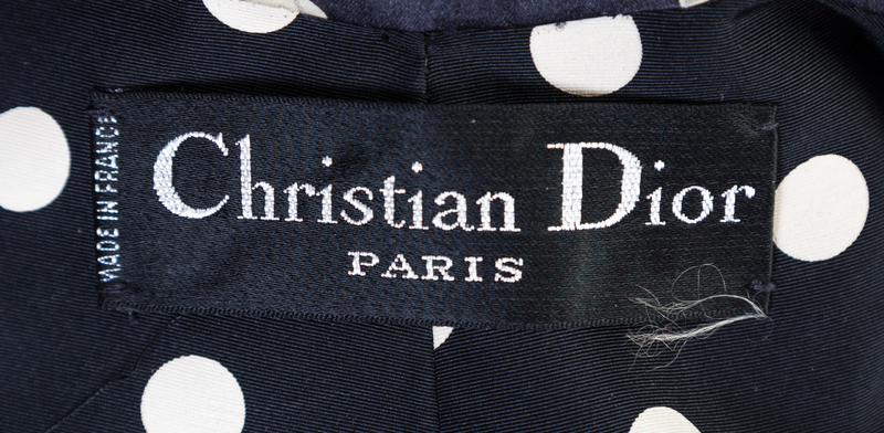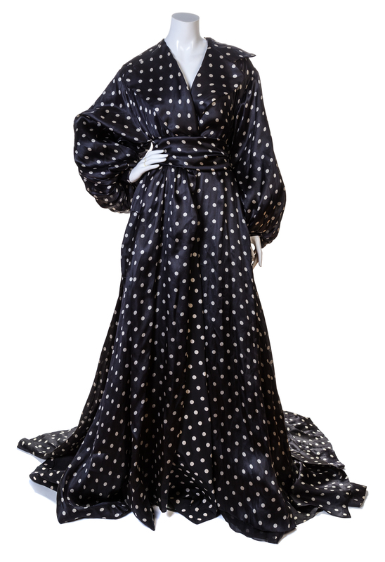 Late 60's/early 70's,of heavy silk taffeta with a sheer silk overlay, wide round lapels, loose and voluminous with a flowing train and billowing bishop sleeves; together with a matching long wrap.Labeled: Christian Dior Paris; tape label C-44 Sonia-Cole.