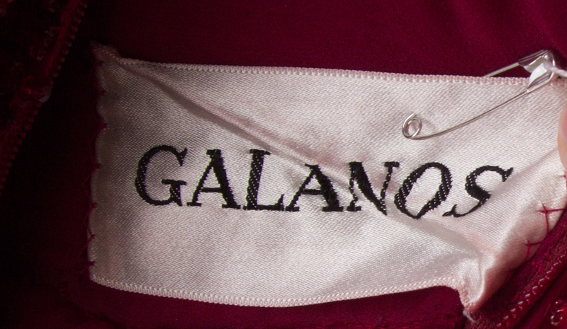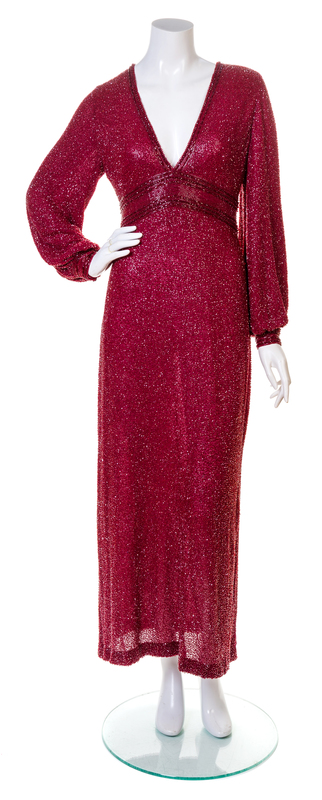 with a plunging V-neckline, gathered cuff sleeves, a side split hem and a back hook and eye closure. Labeled: Galanos.