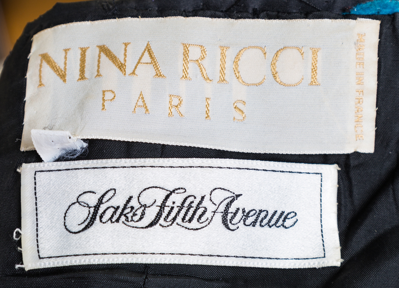 1980's,featuring multicolor velvet raised polka dots, a ruched bodice with a bow accent at the front chest, a trumpet style skirt and a back zip closure.Labeled: Nina Ricci.