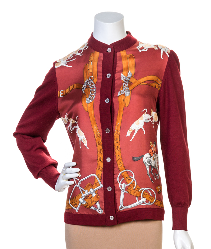 with a hunt scene print designed by Jean De Fougerolle and front button closure.Labeled: Hermes.