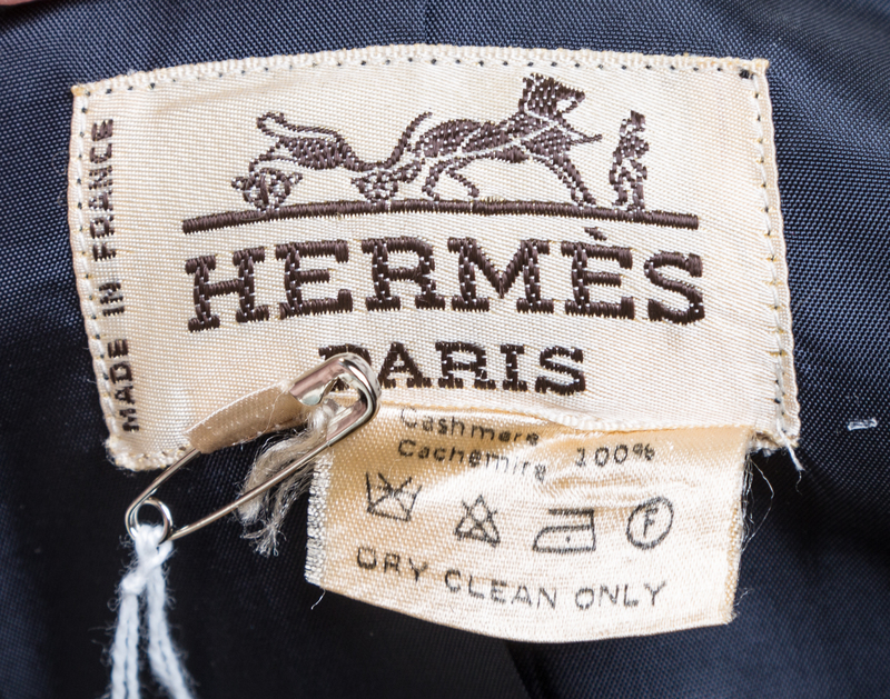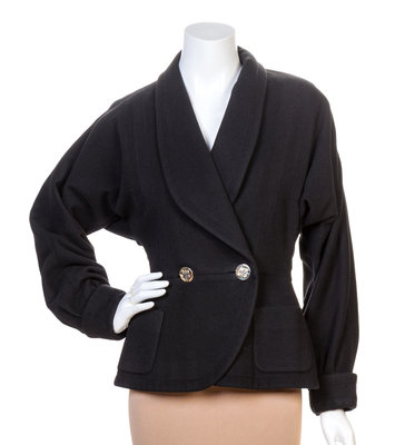 with a shawl collar, decorative "H" buttons, dolman sleeves with cuffs, peplum detail and two front patch pockets.Labeled: Hermes.