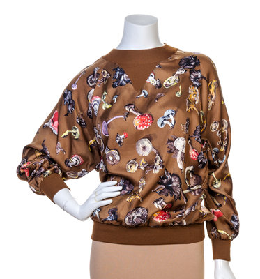 "Champignons" pattern, designed by Anne Gavarni and Francoise De La Perriere; with a ribbed crew neck, cuffs and waist band. Labeled within the print: Hermes.
