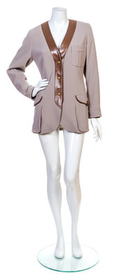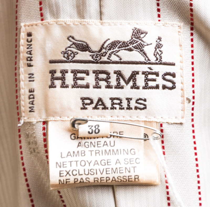with brown leather trim, decorative goldtone logo snap closure at the front and the cuffs, two flap pockets and one patch pocket. Labeled: Hermes.