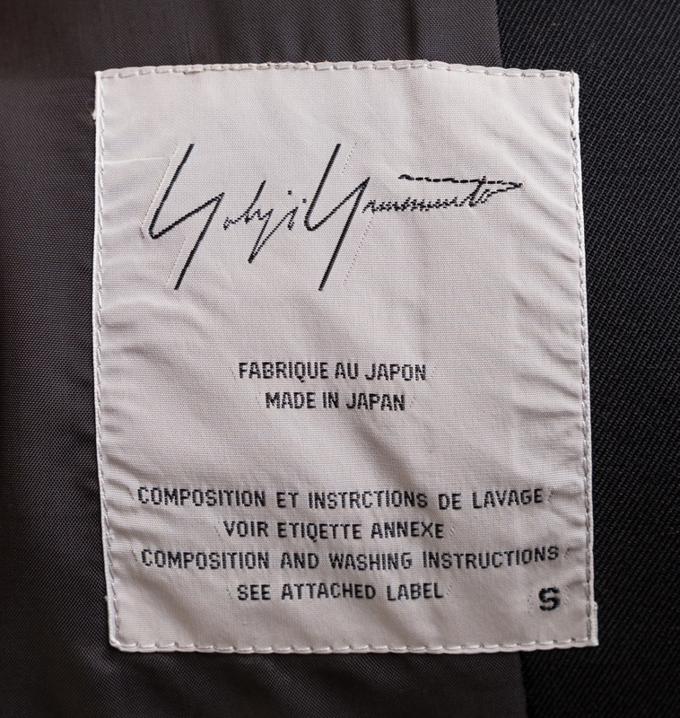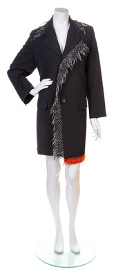 with a notched collar, decorative fringe trim, a three button front closure and front flap pockets.Labeled: Yohji Yamamoto.