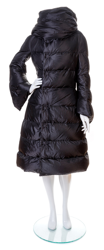 2009,with a cowl neck collar, front snap closure, a zip breast pocket and an open flap detail at the center back; together with a matching puffer scarf.Coat labeled: Junya Wantanabe Comme des Garcons.