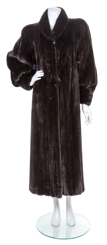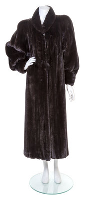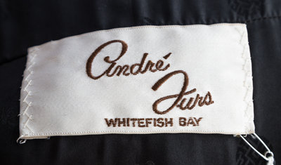 with a shawl collar, fitted cuffs, two front slip pockets, a single button and hook and eye closure and one interior slip pocket.Labeled: Andre Furs.