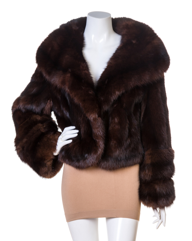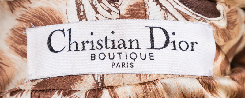 with a shawl collar, bell sleeves, front slip pockets and a brown and cream patterned silk lining.Labeled: Christian Dior Boutique.
