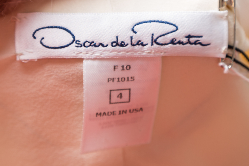 with decorative diamond patterned three quarter length sleeves, an interior hidden ring hook closure and front slip pockets.Labeled: Oscar de la Renta.