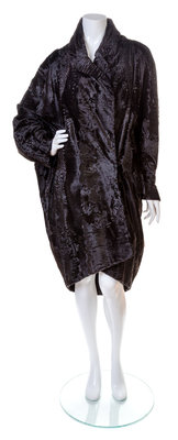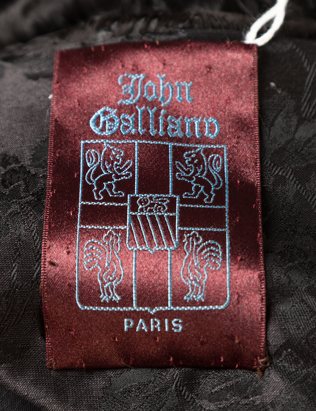 with a notched collar, a single front hook and eye closure, front flap pockets and a decorative floral tonal silk lining.Labeled: John Galliano.