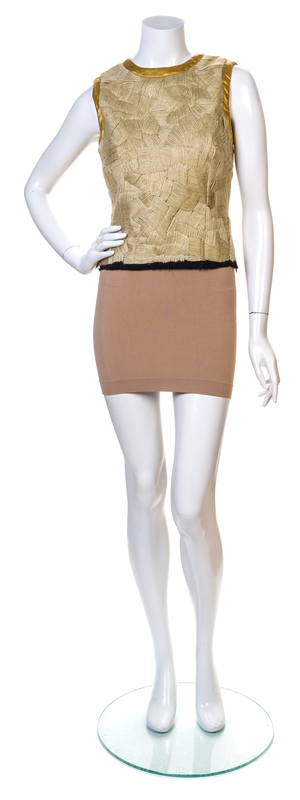 with gold trim at the neckline and arm holes, a black unfinished hem and back snap closure.Labeled: Martin Margiela.