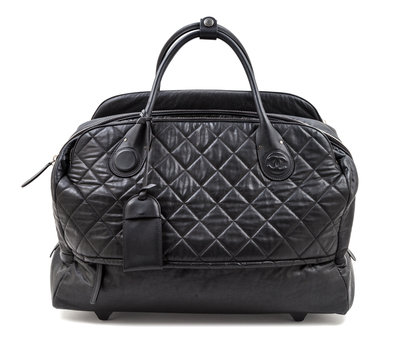 2011, black coated nylon with silvertone and ruthenium hardware, black leather logo accents, dual handles, one external zip pocket, one external slip pocket, a cranberry canvas lining, one internal zip pocket and a retractable handle.Stamped: Chanel.
