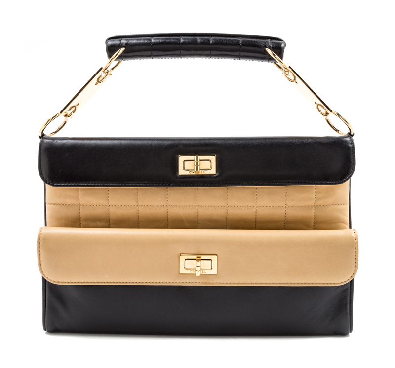 2003-2004,with two front flaps with Mademoiselle goldtone locks, a leather top handle with decorative goldtone logo plates, one front zip pocket and one large interior pocket.Stamped: Chanel.