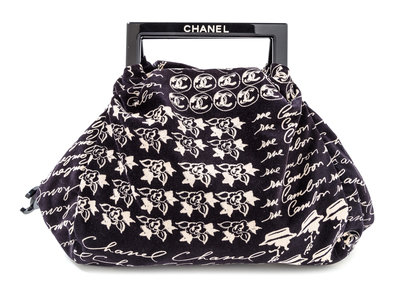 2005-2006, with a script print motif, a zip center closure with a logo charm pull and one interior zip pocket. Stamped: Chanel.