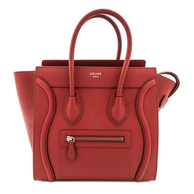 with dual rolled handles, an exterior zip pocket, a top zip closure, red suede lining, three interior pockets and protective studs at the base. Together with a dustbag. Stamped: Celine.