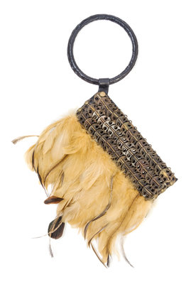 with feather and brass chainmail detail, a circular handle and a zip closure.Stamped: Comolli Coppa.