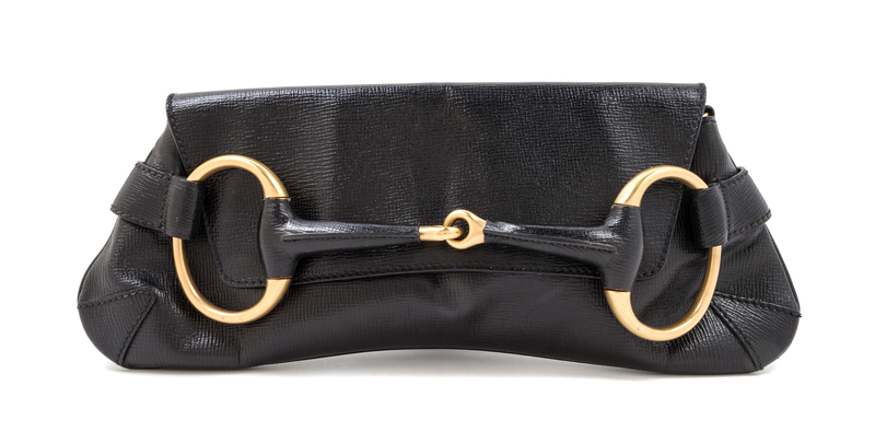 with goldtone hardware, a removable goldtone chain strap, a front snap closure and one interior slip pocket. Stamped: Gucci.