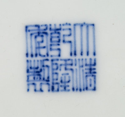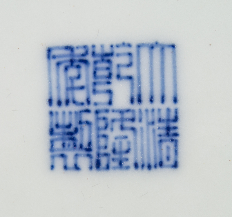 of baluster form, surmounted by a matching domed lid, with two handle-form decorative elements, the underside bearing an apocryphal Qianlong six-character mark in underglaze blue.