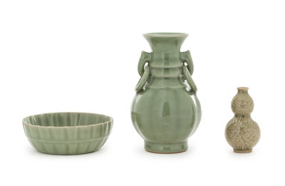 the first a longquan style lobed bowl, the second a longquan style vase of baluster form with ring handles, the third a yaozhou gourd-form vase with foliate underglaze decoration.