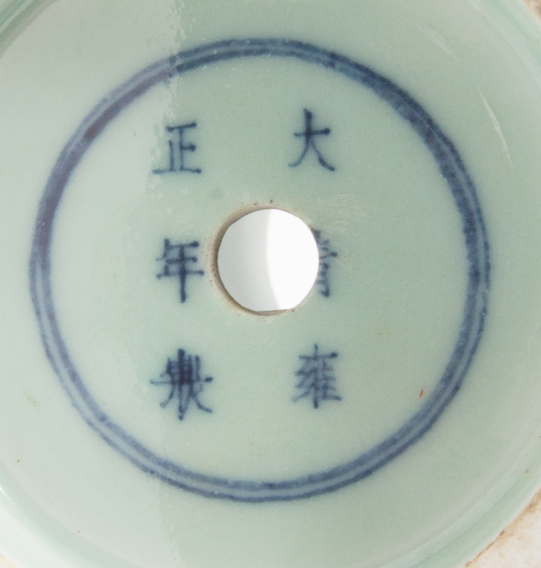 of square form rising to a circular neck, supported on a circular foot, the body decorated with flowers, the underside bearing a Yongzheng six-character mark in underglaze blue, drilled.