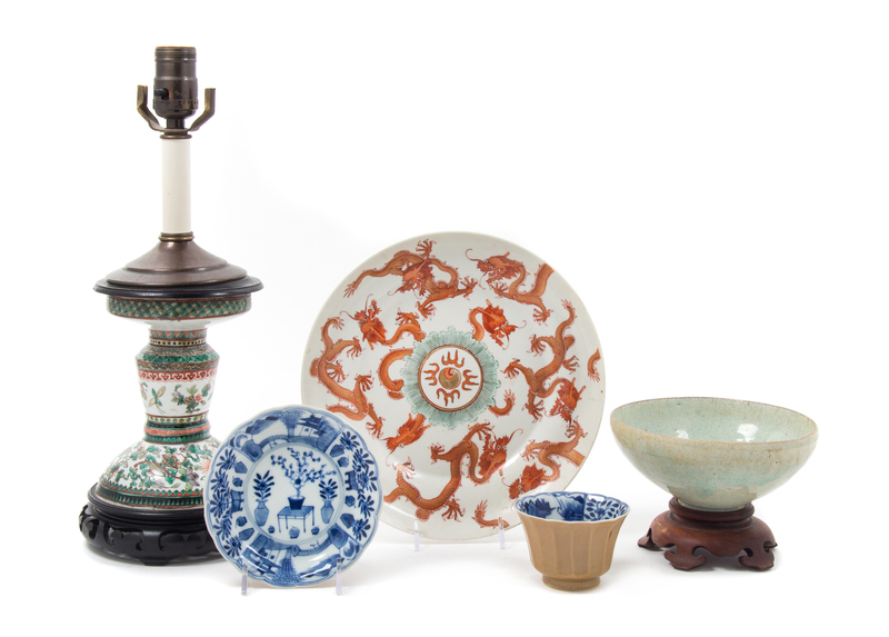 comprising one dragon dish, a lamp, a celadon bowl, a cup and saucer.