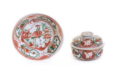 the first a circular covered bowl painted with rabbits and floral sprays, the second a circular dish painted with phoenix and floral decoration.