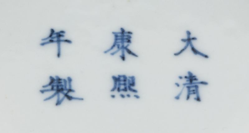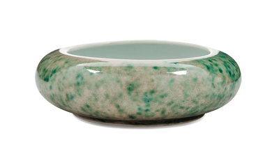 of squat rounded form, covered overall in a pink glaze with green speckles, the underside bearing a Kangxi six-character mark in underglaze blue.