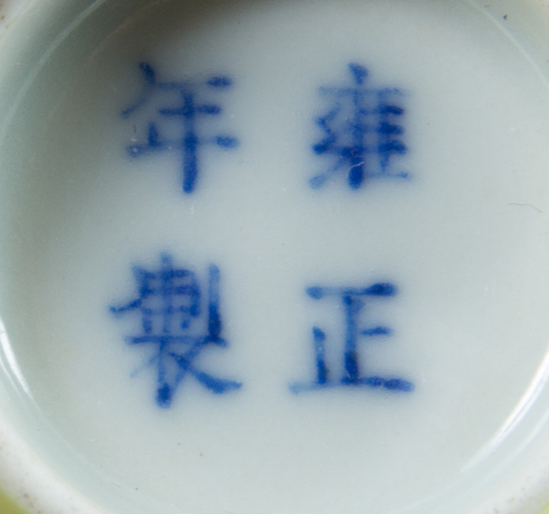 raised on a short straight foot, the exterior covered in a bright yellow glaze, the underside bearing a Yongzheng four-character mark in underglaze blue.