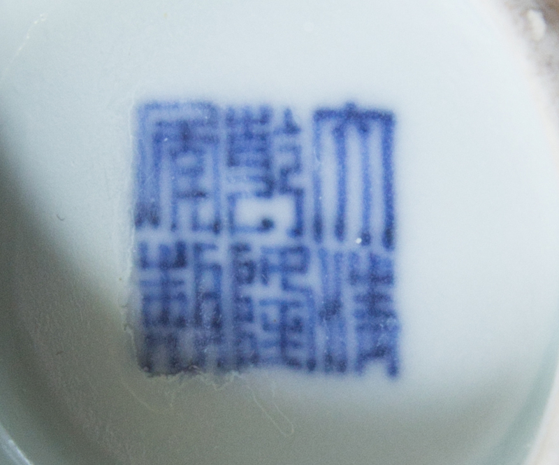 the baluster body with broad shoulders, raised on a short foot, the underside bearing an apocryphal Qianlong six-character mark in underglaze blue.