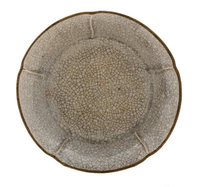 having flaring sides molded as five petals below an metal mounted everted mouth rim, covered overall in a creamy yellow glaze with a fine network of russet and dark brown crackles.