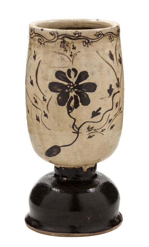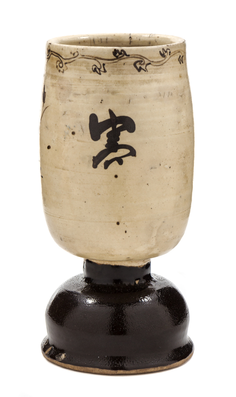 of cylindrical form raised on a baluster form foot surmounted by a recessed stem, the body decorated with floriated and foliate motifs, the unglazed interior and underside revealing the light grey body.