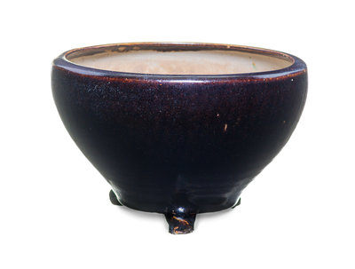 the steep walls surmounted by an inverted mouth rim, raised on three small feet.