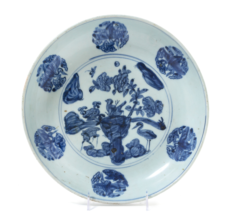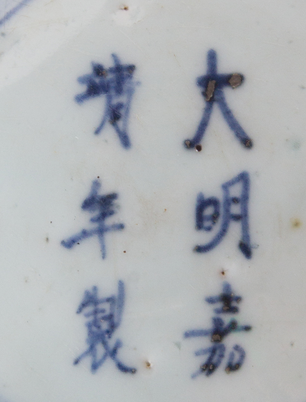 painted to the central roundel with birds perched on flowering branches, the underside bearing a Jiajing six-character mark in underglaze blue.