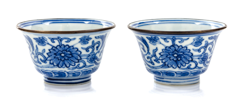 each decorated with floral motifs with a metal mounted mouth rim, each bearing a Kangxi six-character mark in underglaze blue.