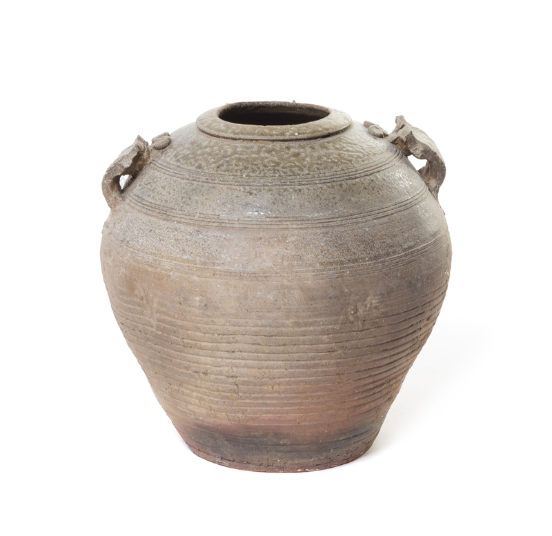 the globular body with broad shoulders applied with a pair of loop handles, decorated with various concentric rings.