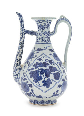 the pear shaped body decorated with shaped reserves enclosing foliate scrolls, interspersed with flower blossoms, the recessed neck painted with further foliate scrolls, applied with an upright spout and a loop handle.