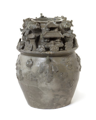 the ovoid body applied with birds, mythical beasts, masks and mock rings, the cover constructed of two levels of decorations depicting houses, figures and flying birds.