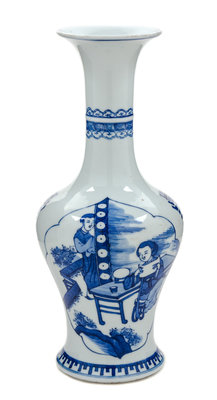 of baluster form, rising to an elongated neck surmounted by a flared mouth rim, raised on a slightly flared base, decorated with two medallions depicting figures in a pavilion, the underside marked with a double band in underglaze blue.