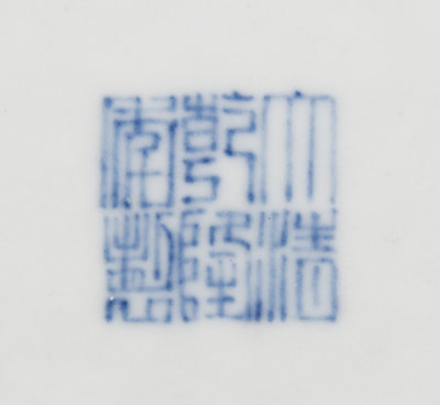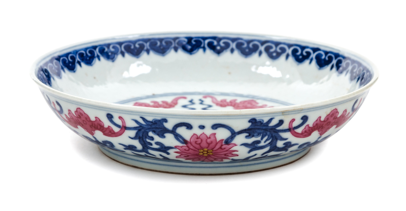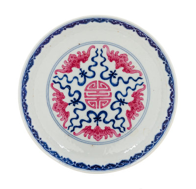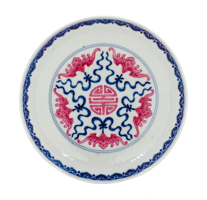 the rounded edges rising to a slightly everted mouth rim, raised on a short foot, the interior central medallion depicting bats and ribbons around a central shou character, the exterior decorated with bats among floriated motifs, the underside bearing an apocryphal Qianlong six-character mark in underglaze blue.