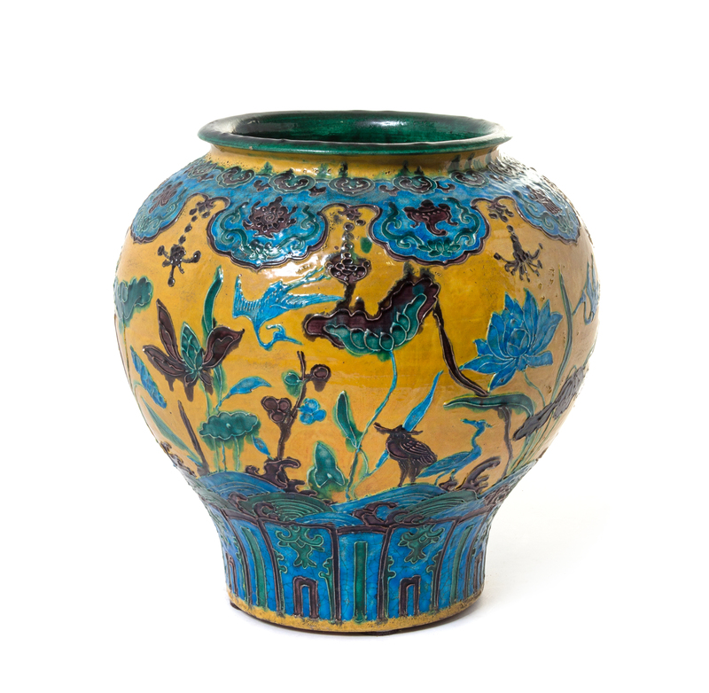 the globular body carved with lotus flowers and cranes on a yellow ground, below a band of ruyi heads enclosing lotus scrolls against blue.