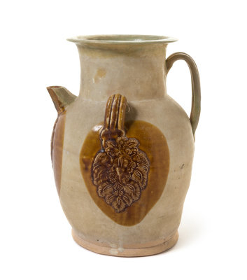 the baluster body rising to a tall cylindrical neck surmounted by a flared mouth, the shoulder set with an upright polygonal spout, a pair of triple-stranded handles and a larger loop handle, the body applied with three leaf-shaped appliques enclosing grapevines, each splashed in brown.