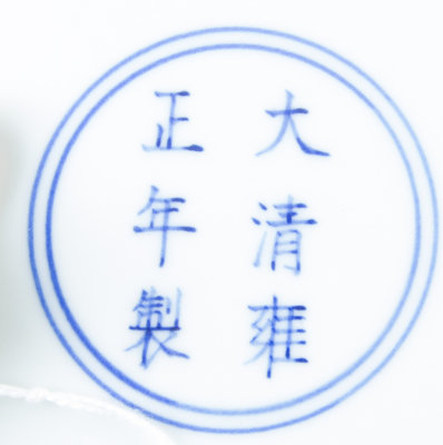 of circular form with the central medallion painted with a small shou characters surrounded by meandering flowering branches, similar floral motifs repeated to the exterior, the underside bearing an apocryphal Yongzheng six-character mark in underglaze blue within a double ring.
