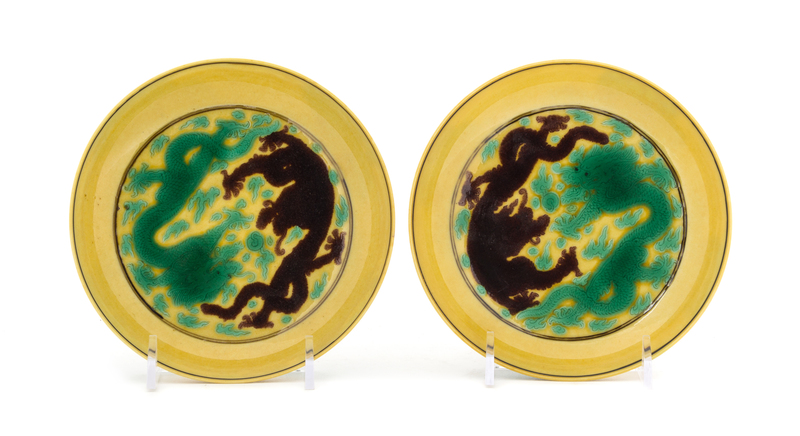 A Pair of Yellow Ground Green and Purple Glazed Porcelain Saucer Dishes