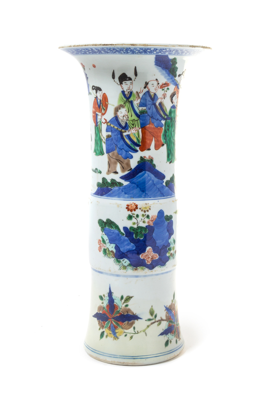 the upper panel painted with figural decoration above flowering plants and rockworks.