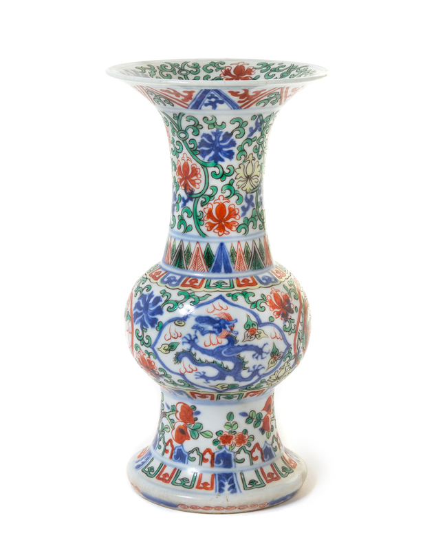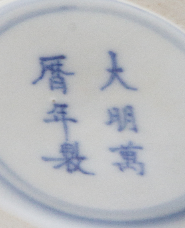 painted with dragon and lotus scrolls, the underside bearing an apocryphal Wanli six-character mark in underglaze blue.