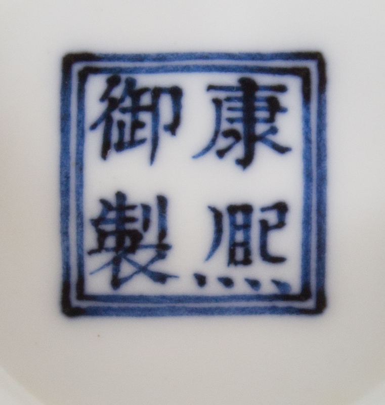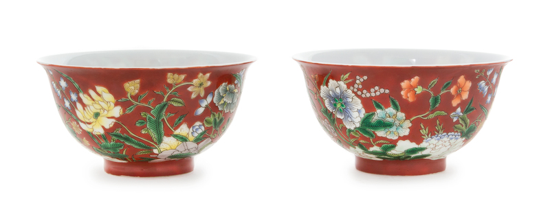 each with steep walls rising to an everted mouth rim, raised on a short straight foot, the exteriors depicting flowers on a red brown ground, the underside bearing an apocryphal Kangxi four-character mark enclosed in a double square in underglaze blue.