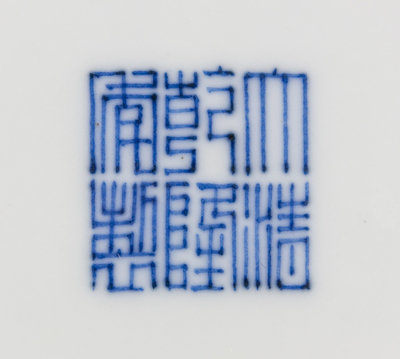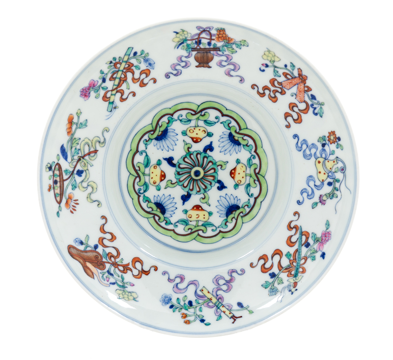 the steep sides flattening out into a wide inverted rim, raised on a short foot, the interior decorated with beribboned Daoist emblems, the exterior decorated with floriated motifs, the underside bearing an apocryphal Qianlong six-character mark in underglaze blue.