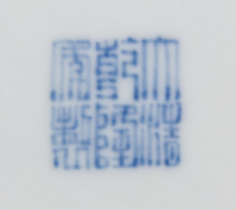 each with rounded wells raised on a straight feet, the exterior painted with san duo motif depicting peaches, pomegranates and lychee, the underside bearing a Qianlong six-character mark in underglaze blue.