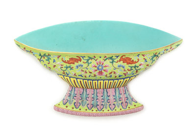 molded in the form of a flattened stem bowl, the interior glazed turquoise with a gilt highlighted rim, above a panel painted with lotus scrolls and a pair of flying bats, the splayed foot decorated with two rows of overlapping leaves and a keyfret band, all against a lime-green ground.