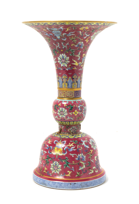 A Ruby-Ground Famille Rose Porcelain Gu -Form Vase